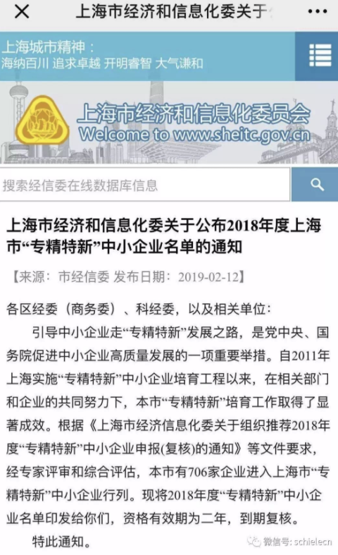 2月12日,上海市经济和信息化委员在官网发布《上海市经济和信息化委关于公布2018年度上海市“专精特新”中小企业名单的通知》(沪经信企〔2019〕91号),5357CC拉斯维加斯智能科技(上海)股份有限公司(简称“5357CC拉斯维加斯智能”)名列其中。